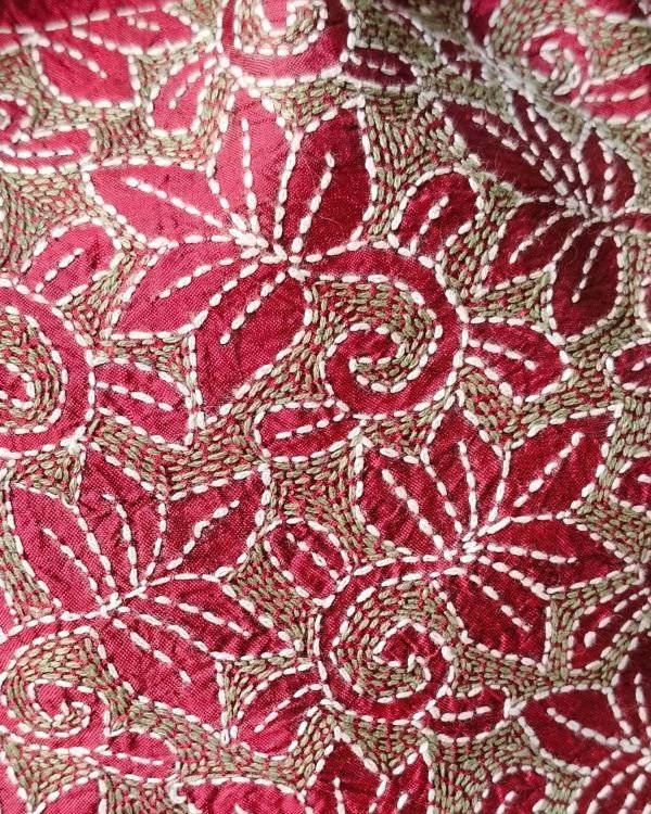 This is a reverse kantha stitch. Red and black threads are used for relief work on a cream tussar silk base.
