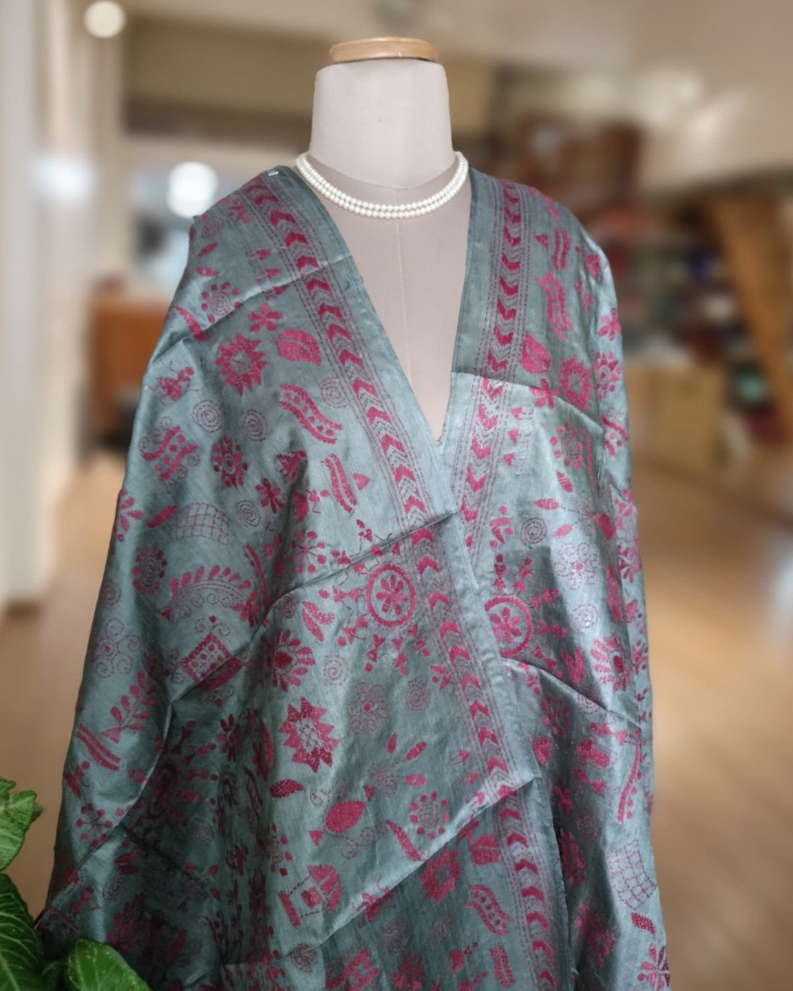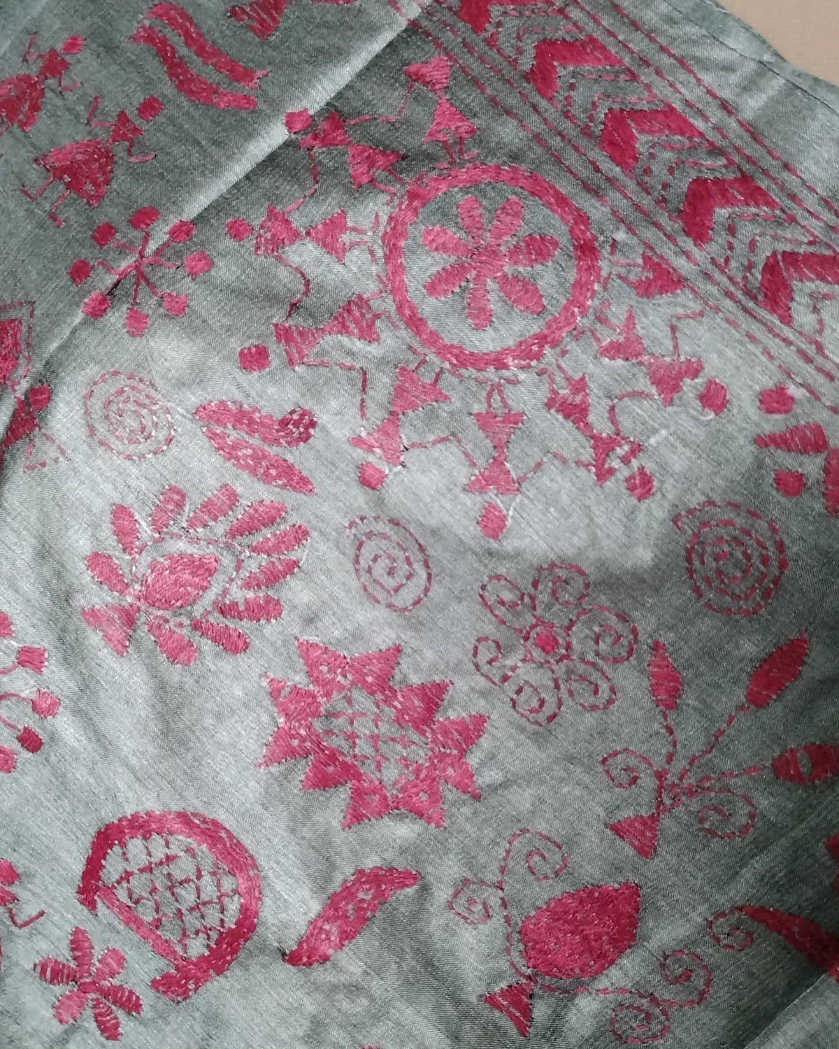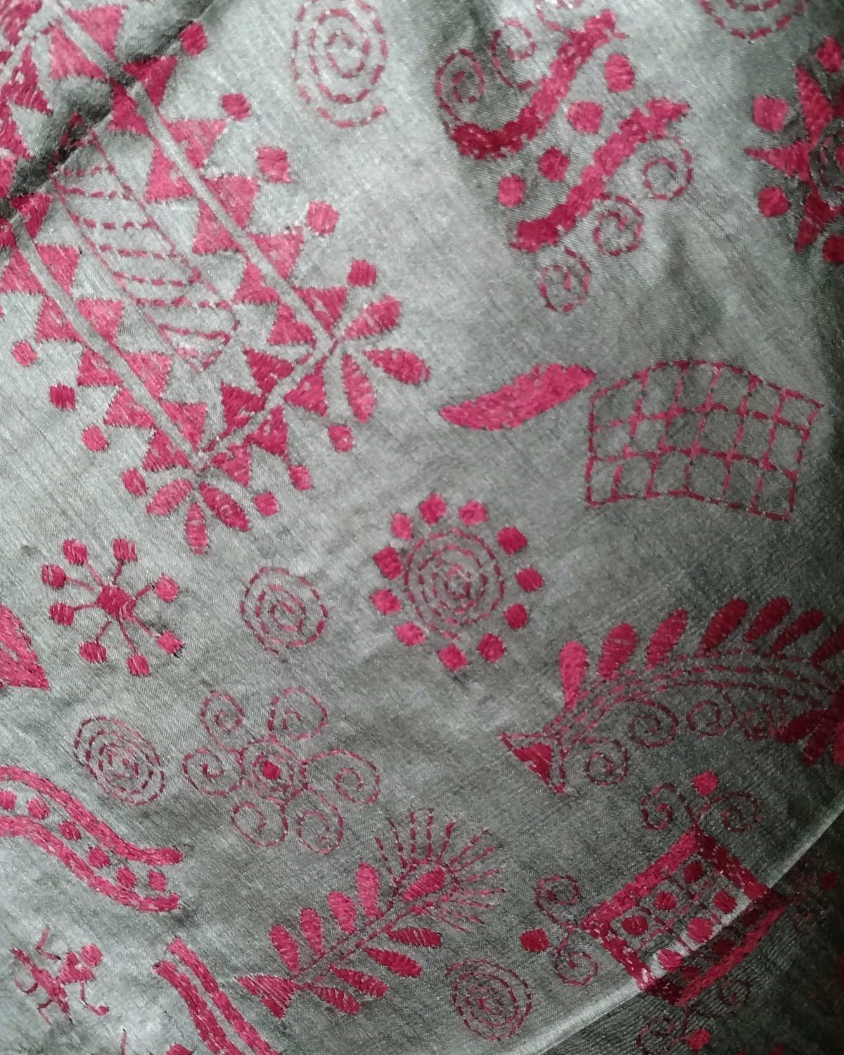 Tussar Silk Kantha Dupatta hand embroidered in West Bengal – Grey